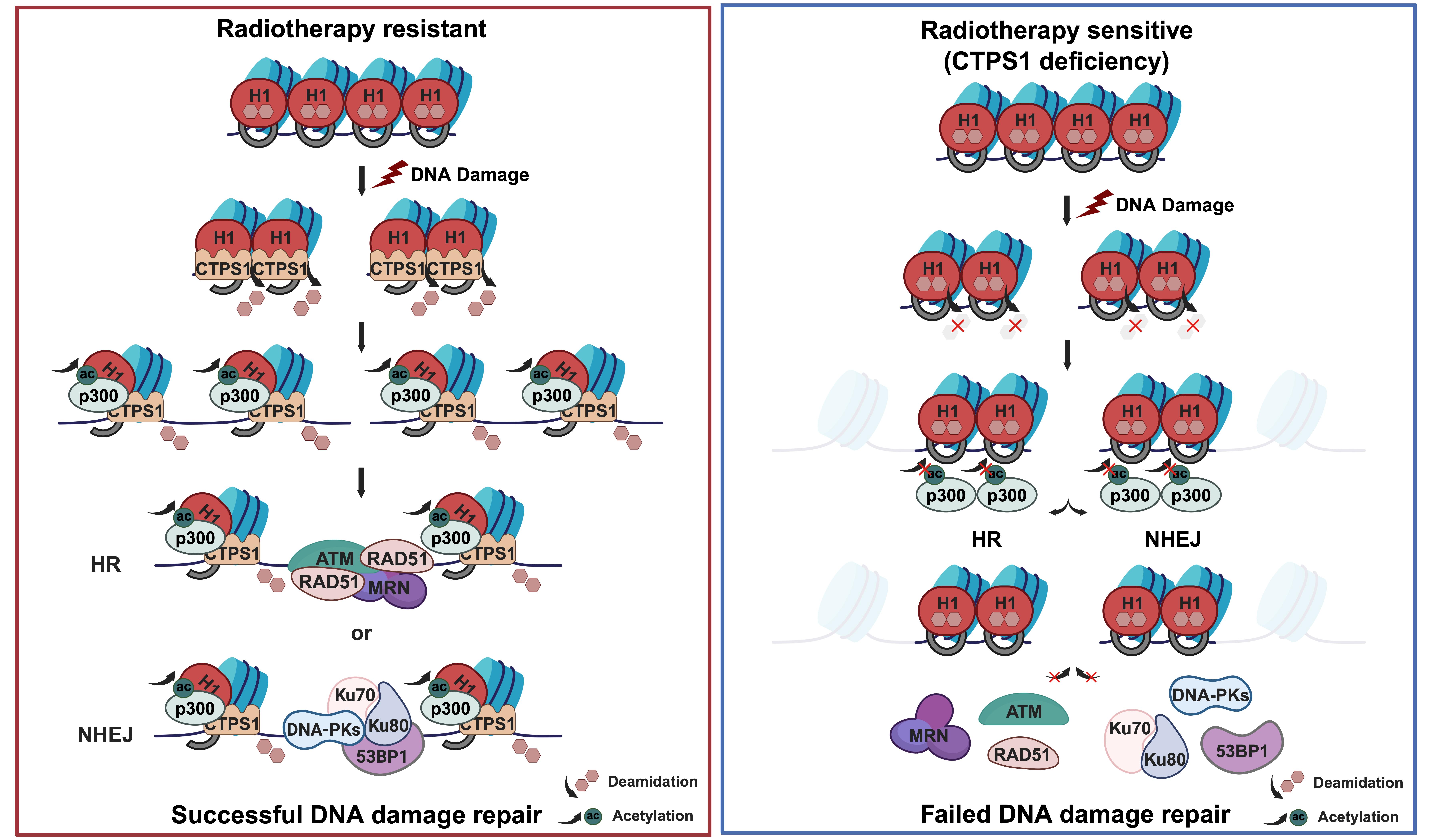 該項研究發現,連接組蛋白H1在DNA雙鏈斷裂發生后,其76和77位點的天冬酰胺殘基(Asn76與Asn77)發生由CTPS1(胞嘧啶三磷酸合成酶)催化的特異性脫酰胺化,并進而促進鄰近75位的賴氨酸殘基(Lys75)發生乙?;?。該研究還發現組蛋白乙酰轉移酶p300對脫酰胺化后的H1具有顯著的底物偏好性,表明脫酰胺修飾促進了后續的乙?;揎検录?。由于H1的75位賴氨酸是位于連接組蛋白H1的球形結構域內,也是與DNA結合的主要功能域,所以該位點的乙?;瘜е铝诉B接組蛋白H1與DNA結合力的減弱,從而引起核小體及染色質的松散并有益于招募DNA損傷修復的關鍵蛋白到DNA損傷位點修復斷裂的DNA。這項研究提示連接組蛋白H1特異位點75位賴氨酸,76和77位的天冬酰胺可能形成一個特異的“開關”控制著染色質的松緊度。該項發現為理解染色質在細胞應激下如何動態變化提供了翔實的數據,也為腫瘤放化療的精準靶標設計夯實了理論基礎。