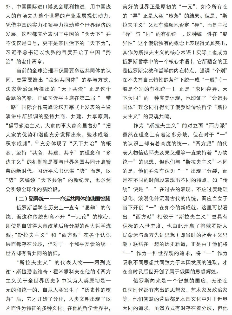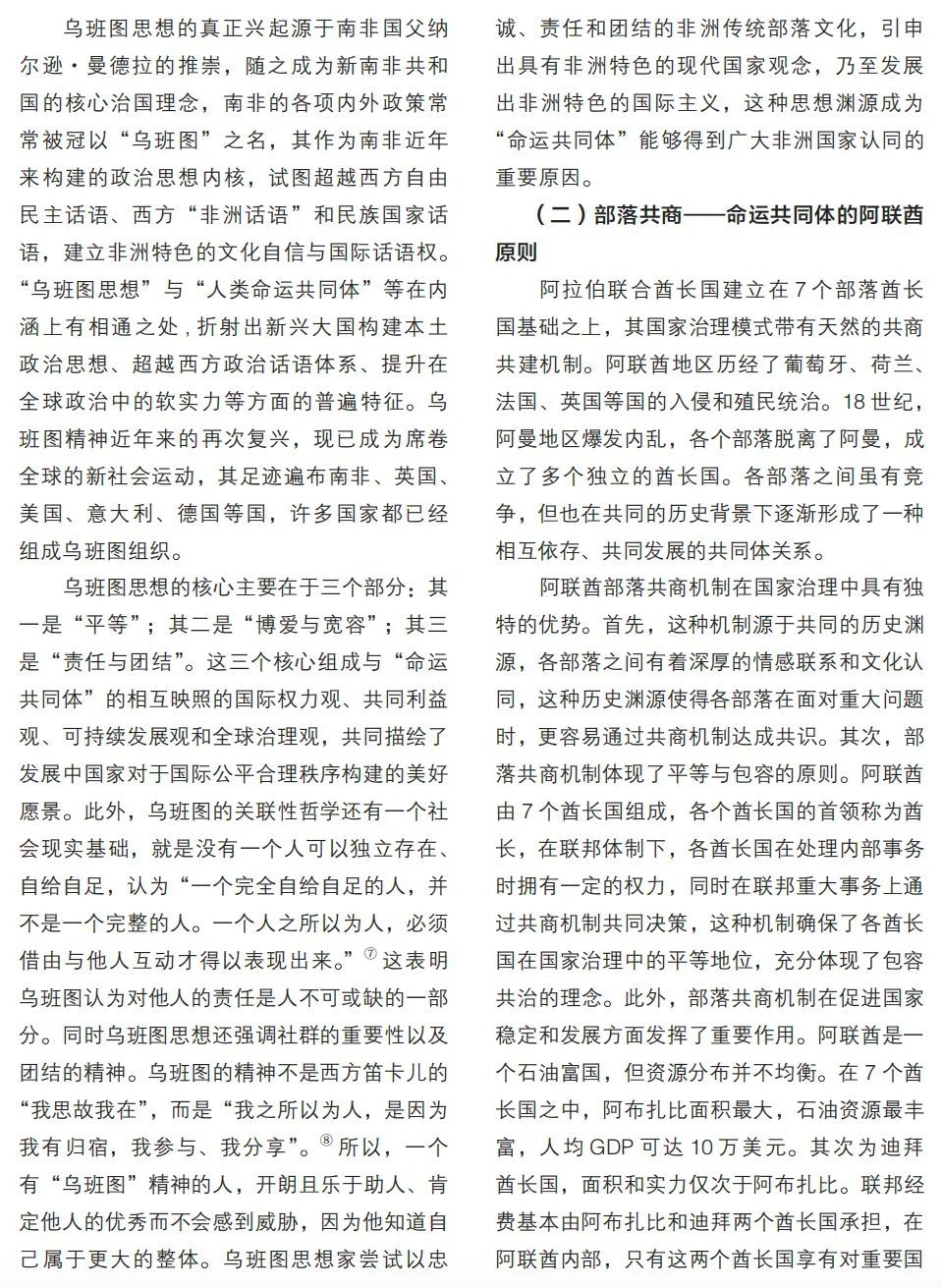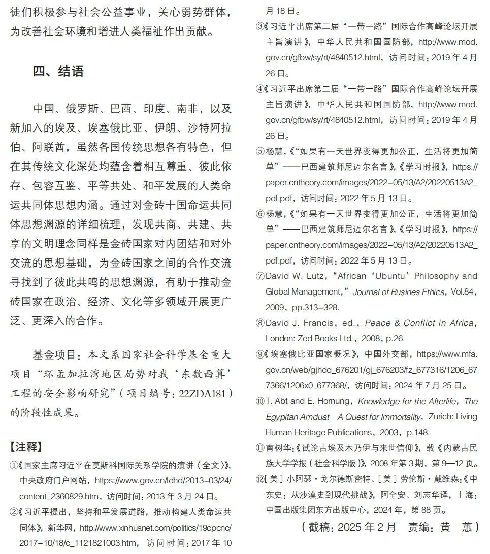 本文梳理金磚十國關(guān)于人類命運(yùn)共同體理念的思想淵源,探討各國傳統(tǒng)文化中與該理念的契合點(diǎn),為金磚國家交流合作提供思想基礎(chǔ)。文章將十個國家命運(yùn)共同體思想基礎(chǔ)的來源分為三大類別:其一,根植于各國傳統(tǒng)與現(xiàn)代思想中的共治理念,分別包含基于“天下共治”的中國理念、“聚異統(tǒng)一”的俄國智慧、以“公正美學(xué)”為內(nèi)核的巴西藝術(shù);其二,成長于部落文化中的共商理念,包含“人外無人”的南非精神、“部落共商”的阿聯(lián)酋原則、“多元共存”的埃塞主張;其三,共生于宗教文化的合一理念,包含“梵我同一”的印度信仰、“人主合一”的沙特境界、“來世永恒”的埃及信念以及“政教合一”的伊朗景觀。通過梳理發(fā)現(xiàn),在金磚十國思想文化深處,均蘊(yùn)含著人類命運(yùn)共同體思想內(nèi)涵,即共商、共建、共享理念。這既是金磚十國文明綿延存續(xù)的強(qiáng)大精神力量來源,也是金磚組織及“全球南方”合力推動全球治理變革的思想基礎(chǔ)。