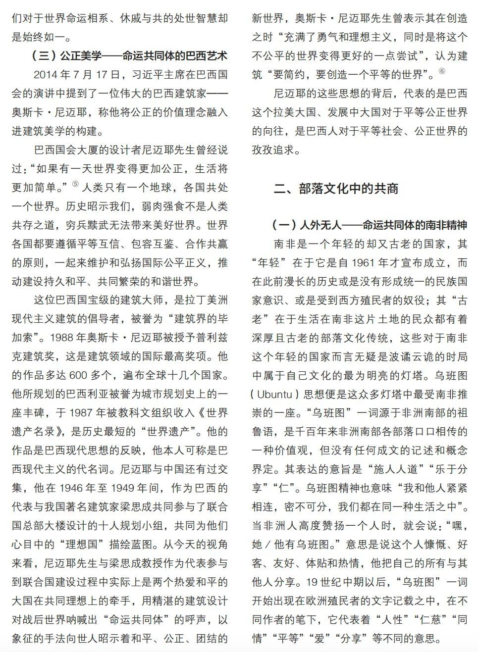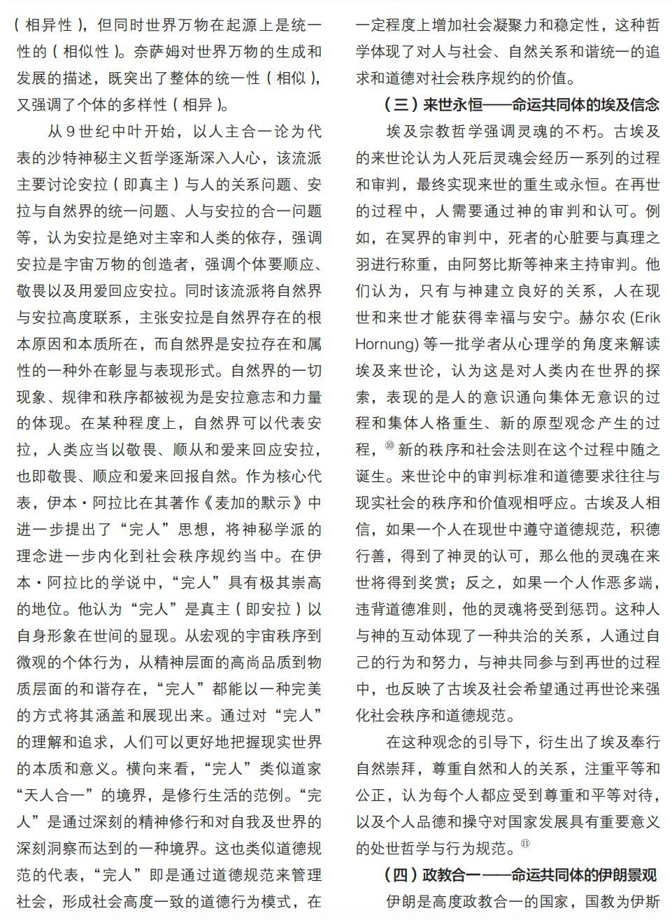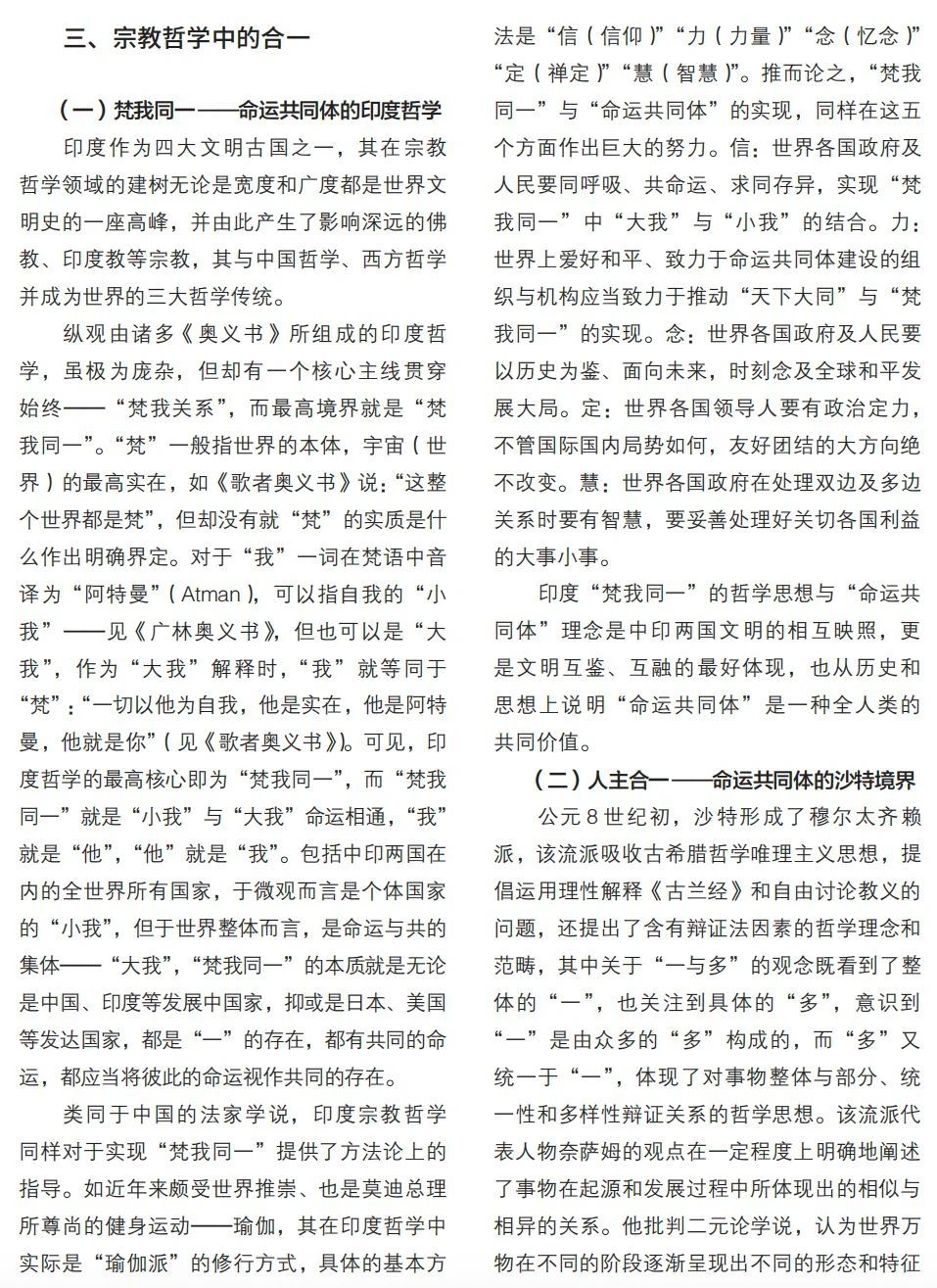 本文梳理金磚十國關(guān)于人類命運(yùn)共同體理念的思想淵源,探討各國傳統(tǒng)文化中與該理念的契合點(diǎn),為金磚國家交流合作提供思想基礎(chǔ)。文章將十個國家命運(yùn)共同體思想基礎(chǔ)的來源分為三大類別:其一,根植于各國傳統(tǒng)與現(xiàn)代思想中的共治理念,分別包含基于“天下共治”的中國理念、“聚異統(tǒng)一”的俄國智慧、以“公正美學(xué)”為內(nèi)核的巴西藝術(shù);其二,成長于部落文化中的共商理念,包含“人外無人”的南非精神、“部落共商”的阿聯(lián)酋原則、“多元共存”的埃塞主張;其三,共生于宗教文化的合一理念,包含“梵我同一”的印度信仰、“人主合一”的沙特境界、“來世永恒”的埃及信念以及“政教合一”的伊朗景觀。通過梳理發(fā)現(xiàn),在金磚十國思想文化深處,均蘊(yùn)含著人類命運(yùn)共同體思想內(nèi)涵,即共商、共建、共享理念。這既是金磚十國文明綿延存續(xù)的強(qiáng)大精神力量來源,也是金磚組織及“全球南方”合力推動全球治理變革的思想基礎(chǔ)。